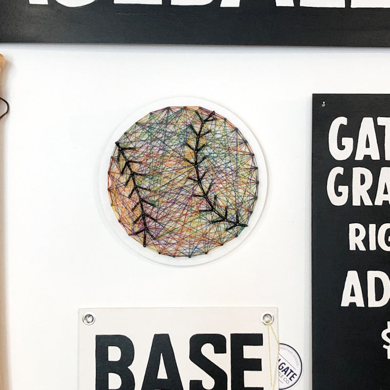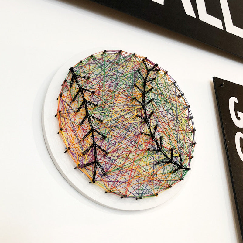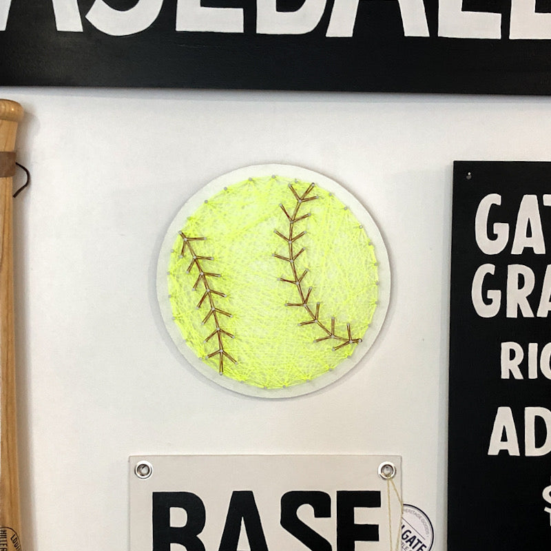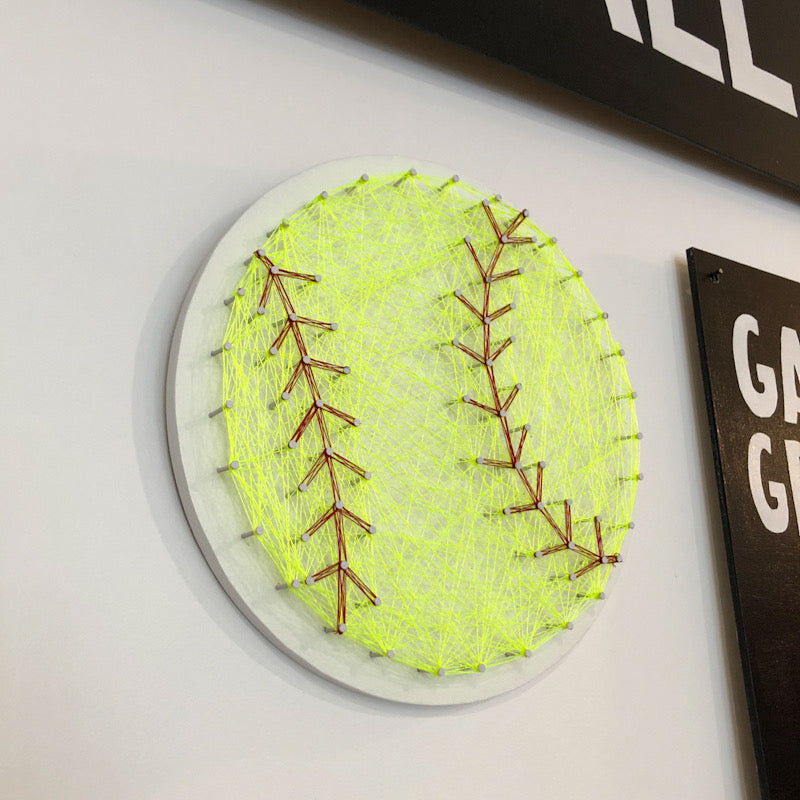 Get creative with the colours - make it a softball, traditional baseball, pop art style ball...the options are unlimited. You can also get creative with the type of board you want to use and the shape. We have used circles made of MDF in the past as well as stained square pine boards.