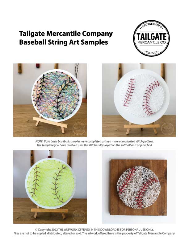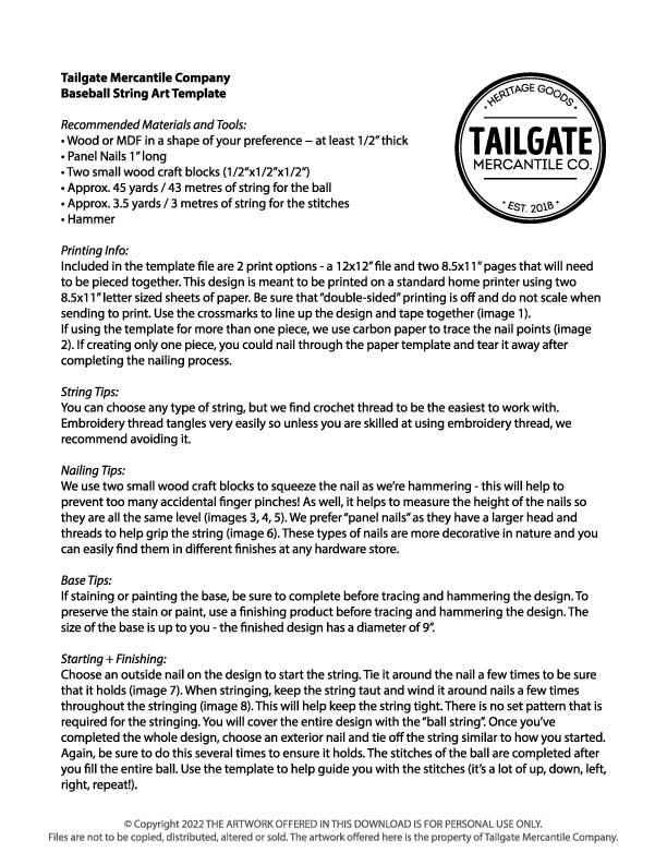 1 – Baseball String Art Instruction sheet including how-to photos, detailed instructions and tips